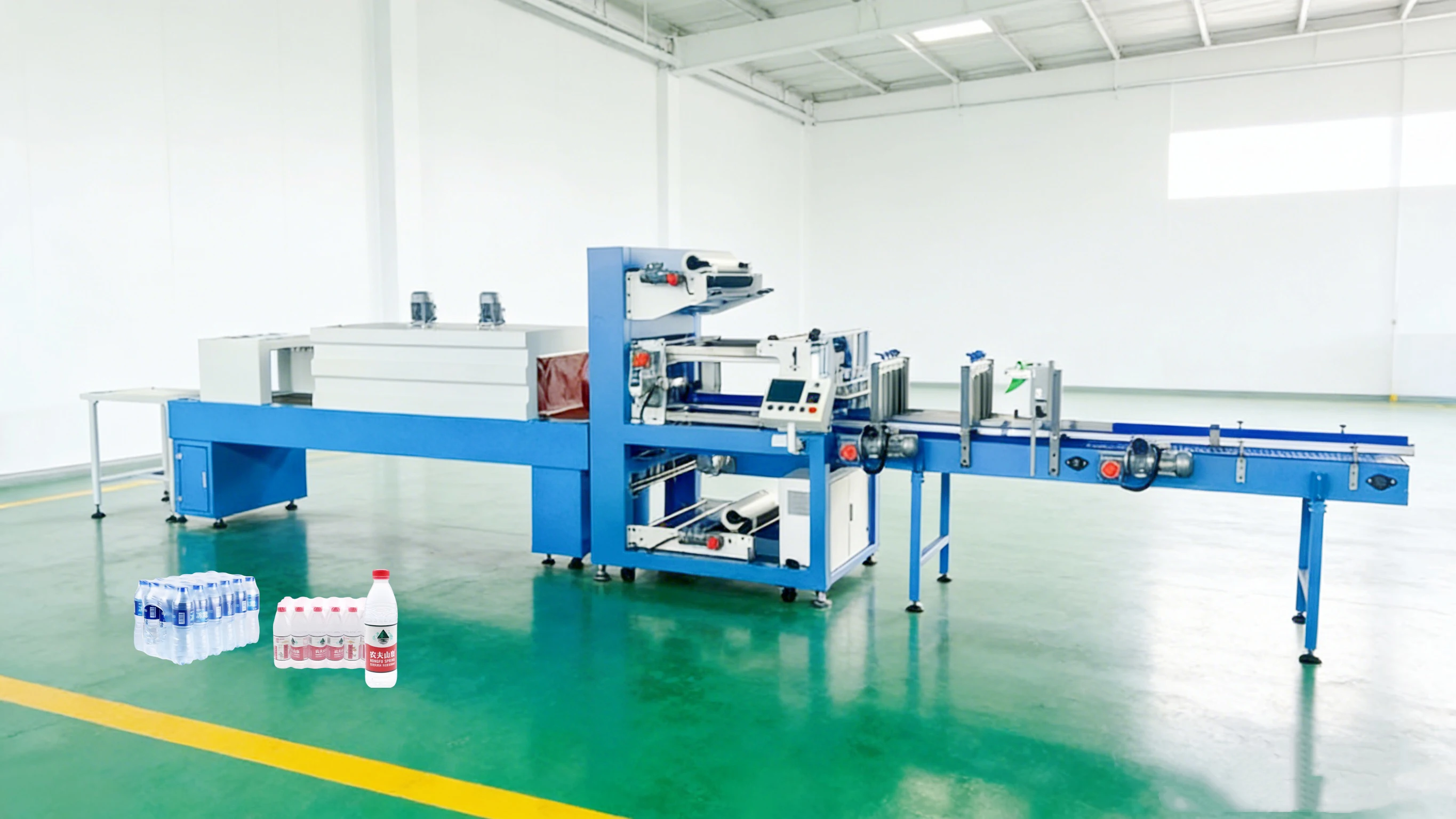 2. Memanaskan produk yang dibungkus film shrink saat melewati mesin, menyebabkan film menyusut rapat di sekitar barang—mengamankan paket setengah palet/kasing untuk transportasi.