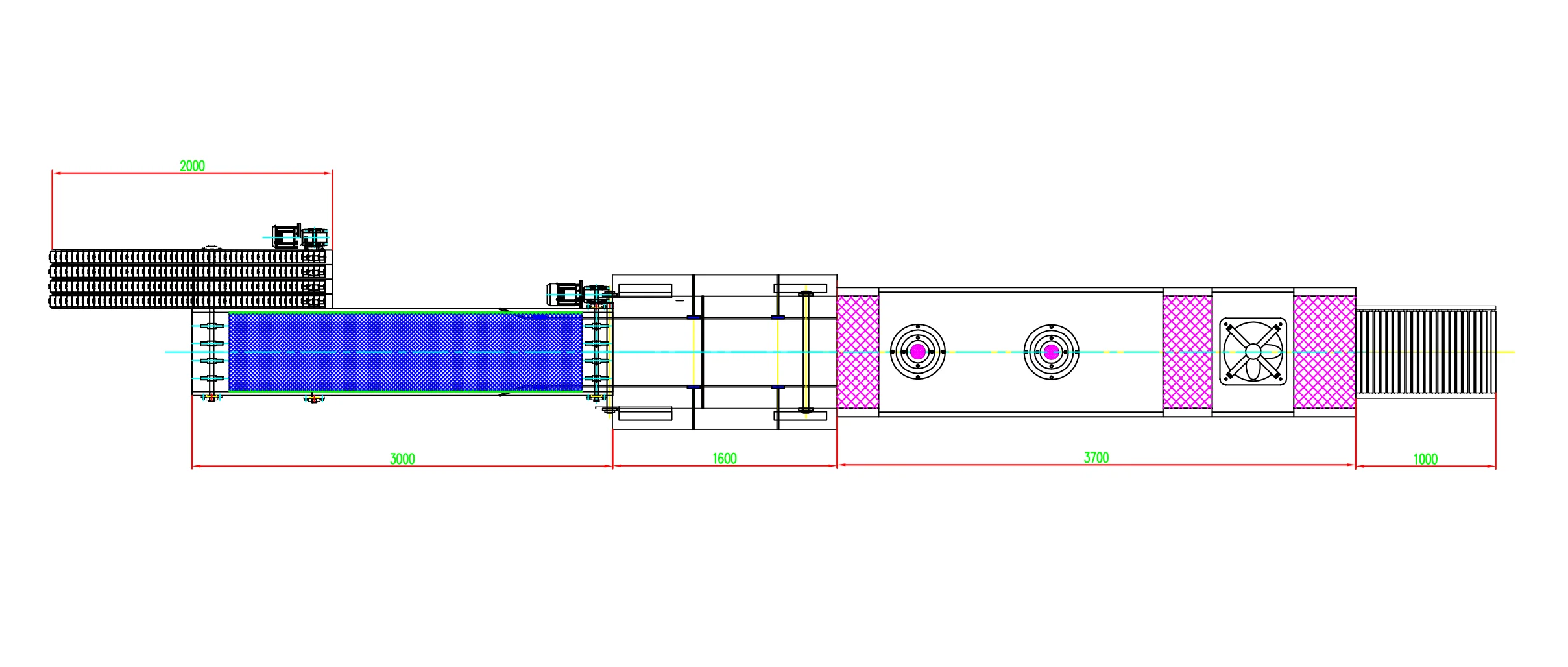 Bagian atas merupakan dudukan gulungan film (menampung gulungan film peregangan besar), sedangkan bagian bawah menggunakan rol dan sistem rantai untuk menggerakkan dan memberikan tegangan pada film secara vertikal untuk mesin linear besar