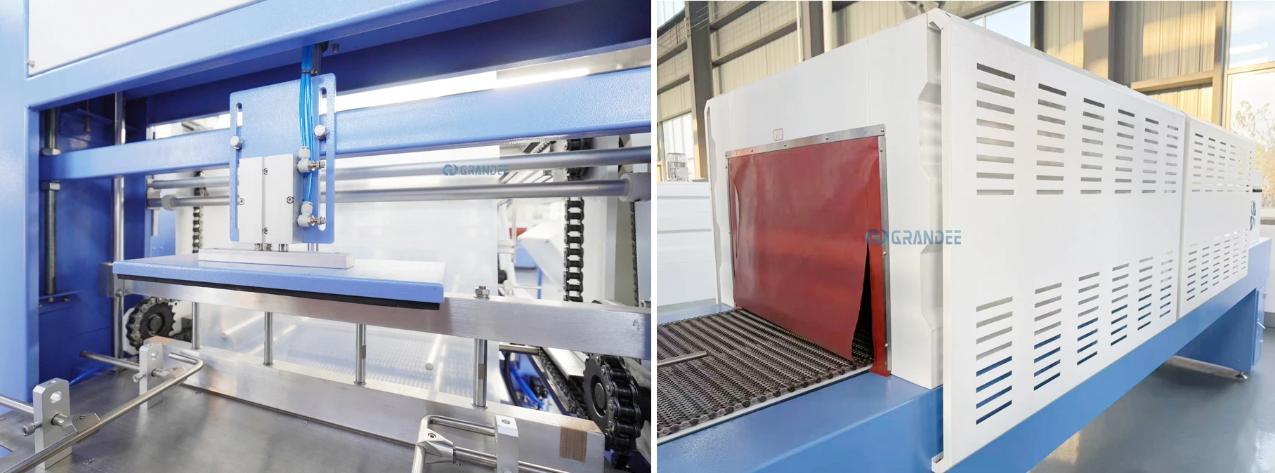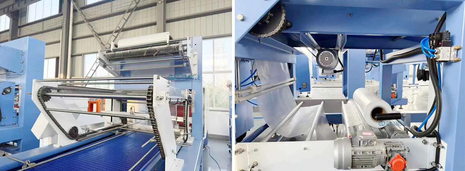 2. Memanaskan produk yang dibungkus film shrink saat melewati mesin, menyebabkan film menyusut rapat di sekitar barang—mengamankan paket setengah palet/kasing untuk transportasi.