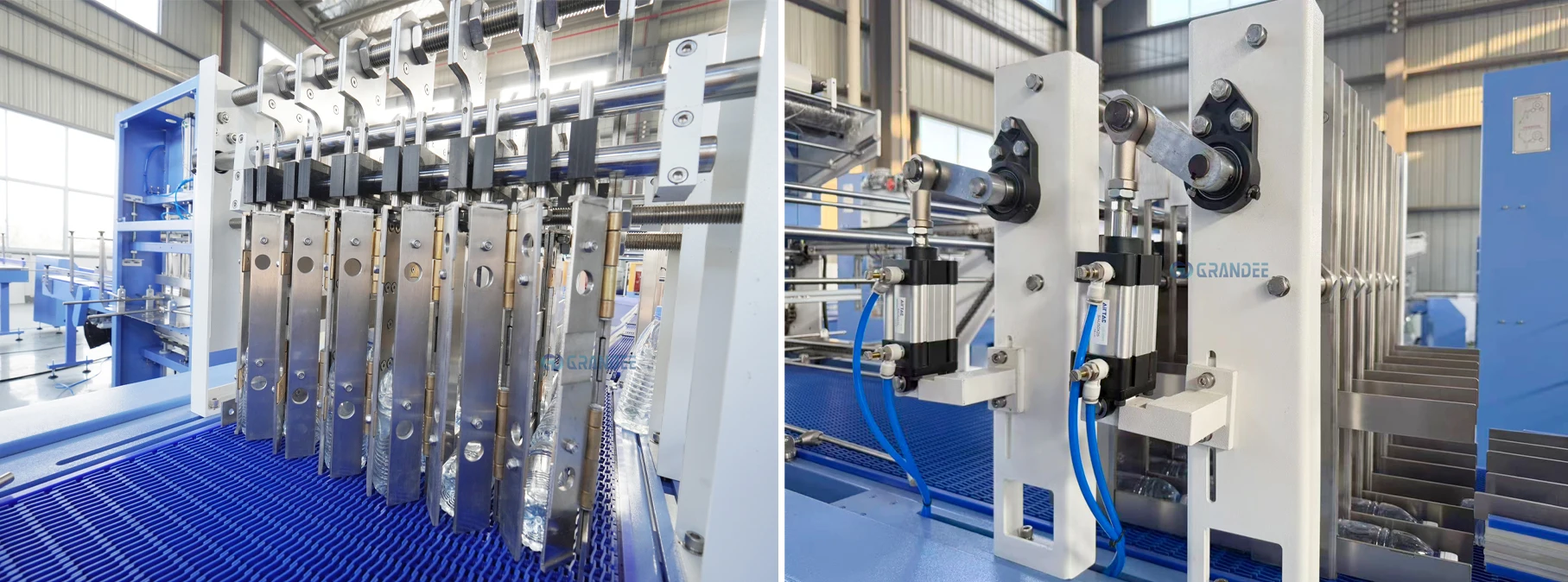 Menggunakan pelat pembagi yang dapat disetel untuk mengumpulkan produk satu lajur ke dalam unit kemasan tertentu sambil secara tepat mengatur jarak dan tata letak produk.