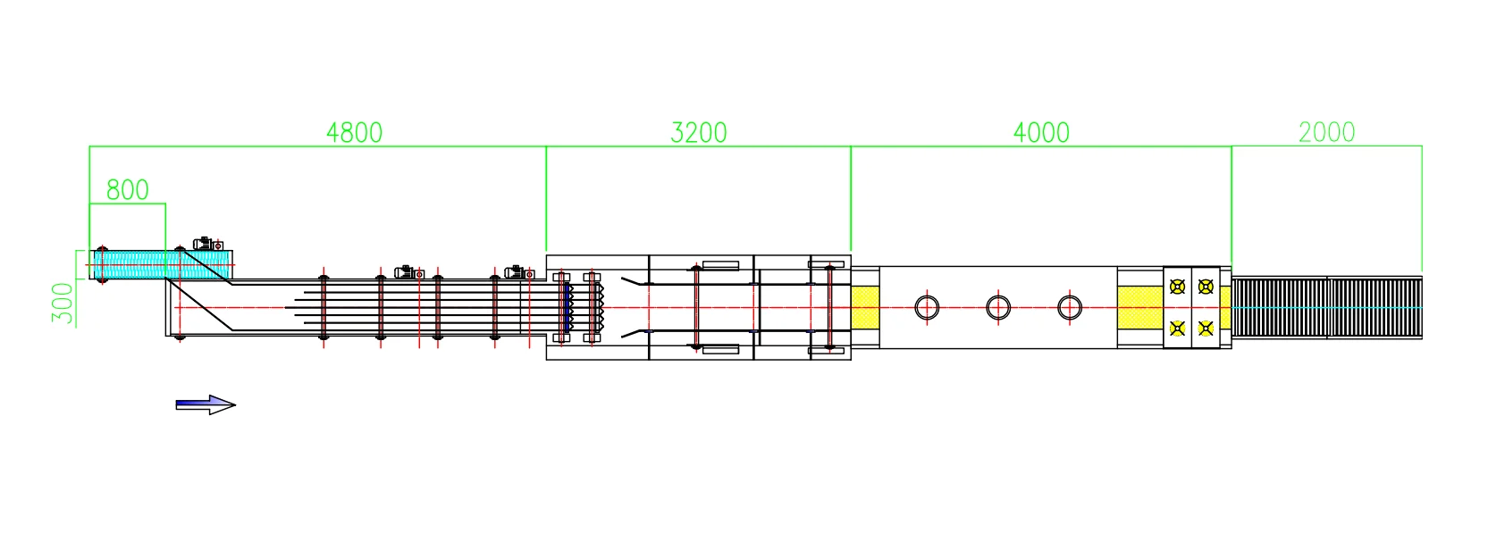Bagian atas merupakan dudukan gulungan film (menampung gulungan film peregangan besar), sedangkan bagian bawah menggunakan rol dan sistem rantai untuk menggerakkan dan memberikan tegangan pada film secara vertikal untuk mesin linear besar